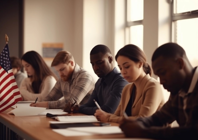 - 시험 구성: 영어 읽기/쓰기/말하기 + 미국 시민권 시험 문제(총 100문제 중 무작위 10문제 출제, 6문제 이상 정답 시 통과)